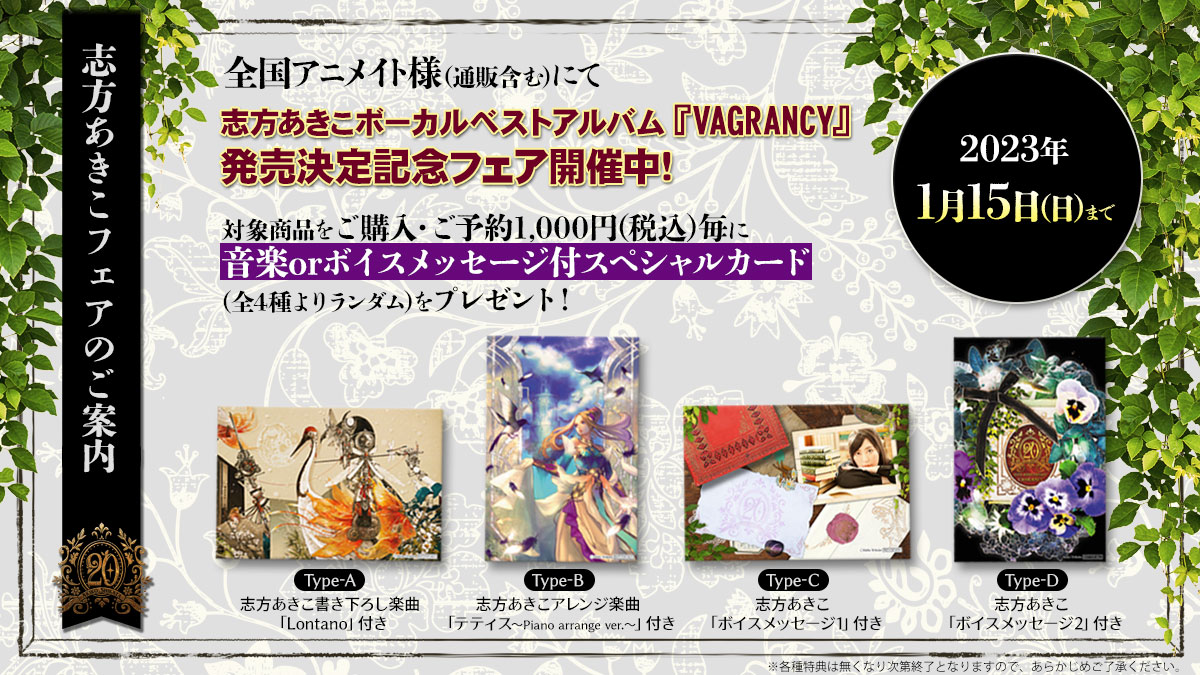 志方あきこボーカルベストアルバム『VAGRANCY』「公式ショップ特装盤」キャンセル販売のお知らせ(12/17更新)